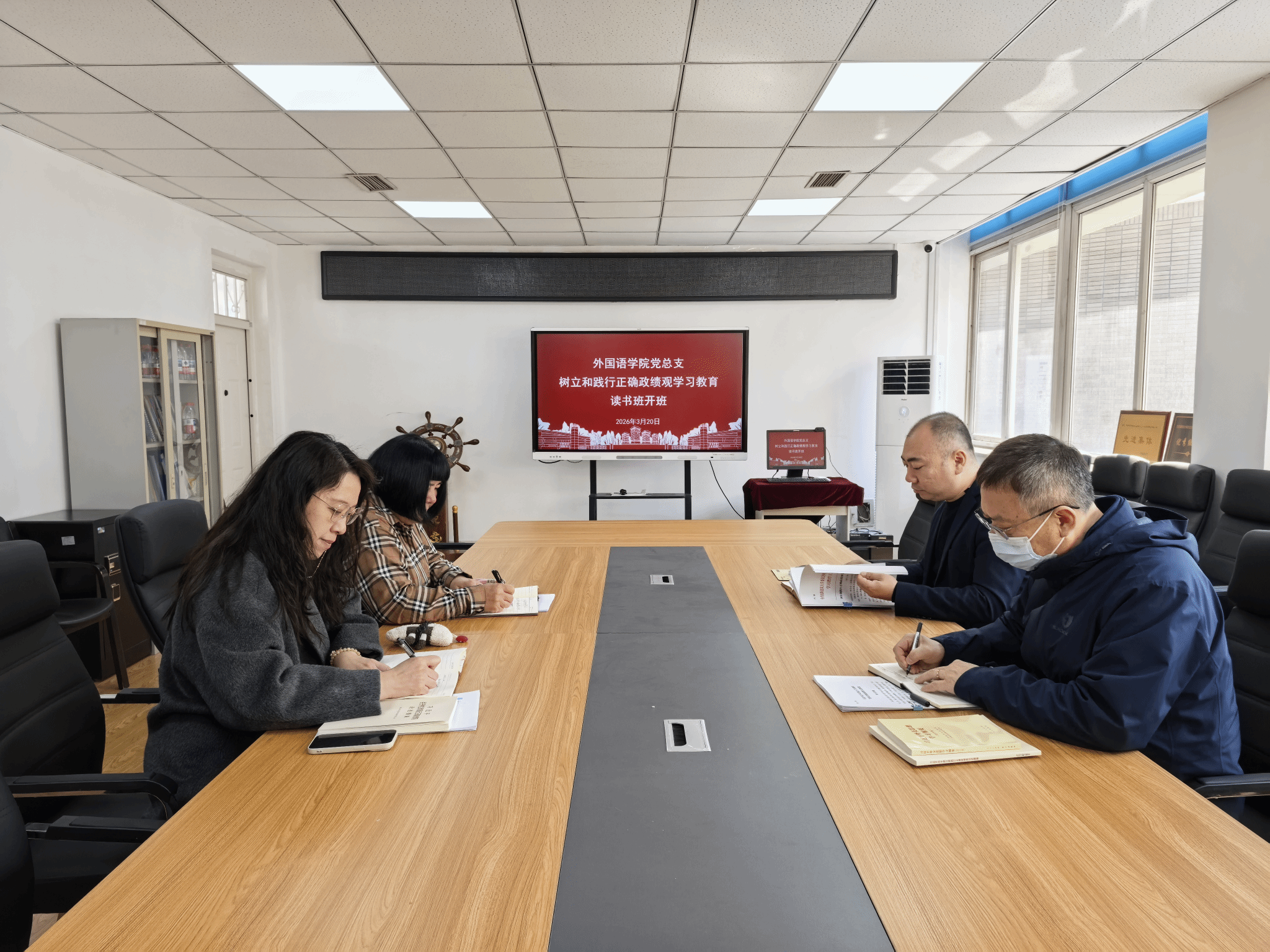 3월 20일 외국어학원 당지부에서는 올바른 정치수행관을 확립하고 실천하기 위한 학습교육강좌를 진행하였습니다 본교 당지부 서기 왕시바이가 학습을 주재하였고 본교 지도팀 성원들이 집중 학습에 참여하였습니다