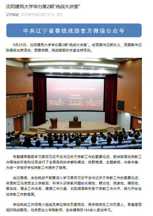 성당 통일전선 공작부 WeChat 공개 계정: 선양 건사대학 제2회 "통일전선 강의실" 개최