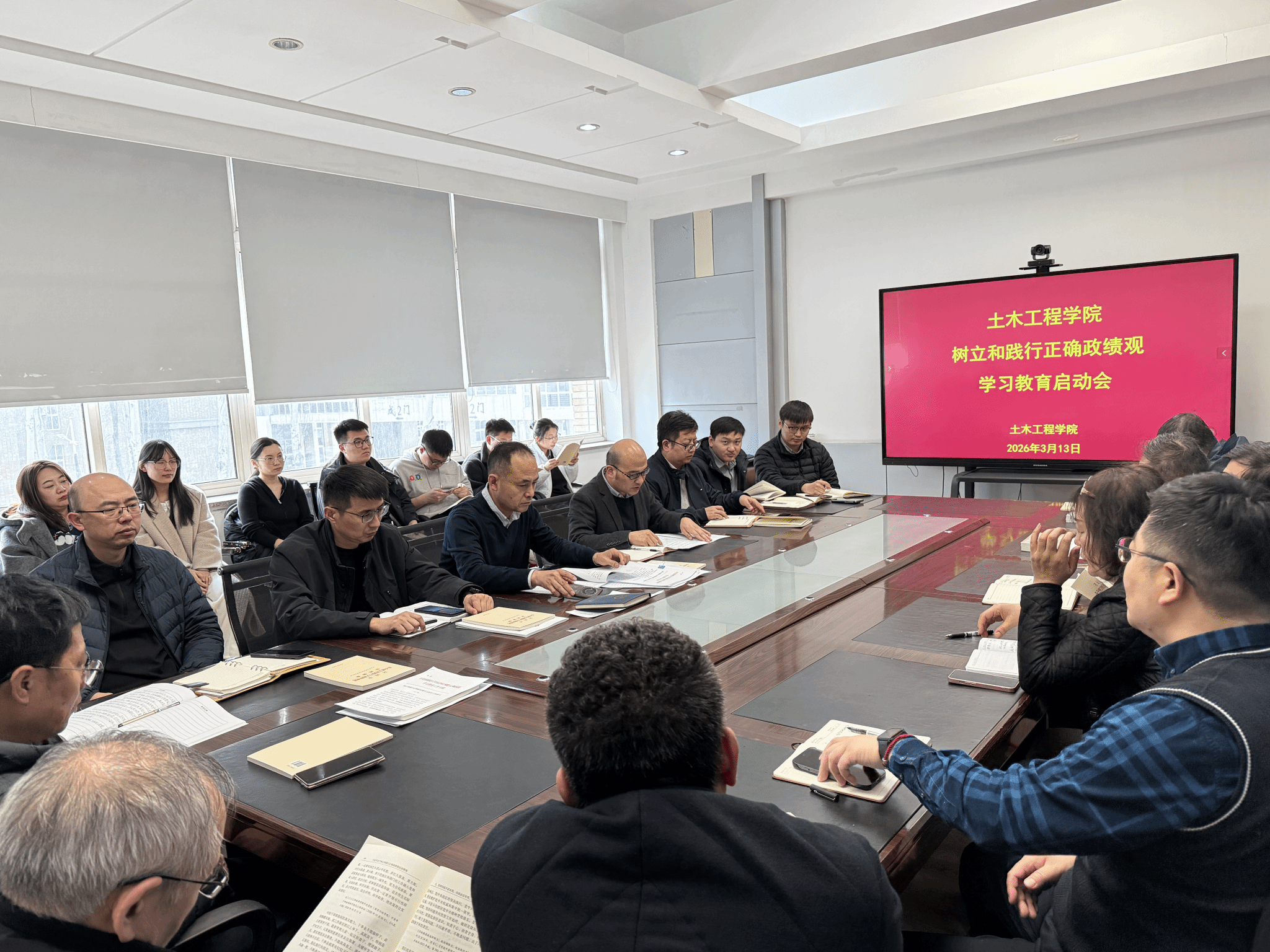 3월 13일 토목공학과 당위원회는 정2-205 회의실에서 당위원회(확대)회의를 열어 올바른 정치관을 확립하고 실천하기 위한 연구교양사업을 전개하였습니다 회의에는 대학 지도팀 성원들, 당위원회 위원들, 당 지부비서들, 교학부장들 등이 참석했다 대학 당위원회 비서가 파견 연설을 했고 학장은 중공중앙 총판에서 발표한 《전당의 올바른 정치관 확립 및 실천에 관한 학습교육 실시에 관한 통지문》의 정신과 대학 관련 업무 계획을 전달했습니다