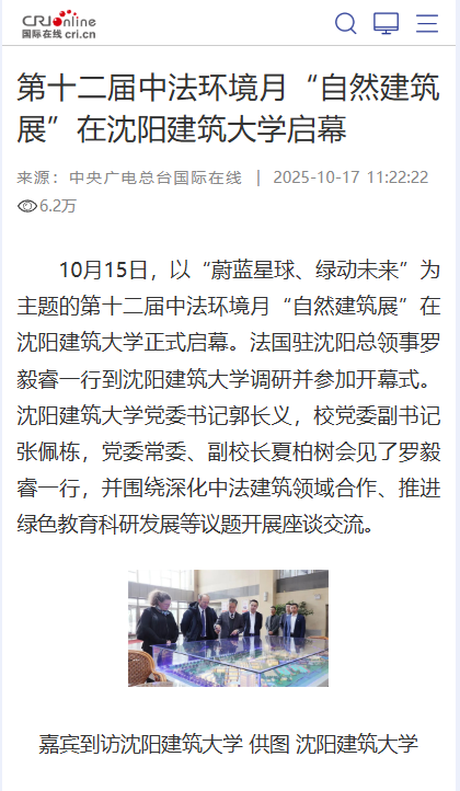 편집자 주:10월 15일, "푸른 행성, 녹색 미래"를 주제로 한 제12회 중국-프랑스 환경의 달 "자연 건축 전시회"가 선양 젠서 대온라인카지노에서 공식적으로 개막했습니다 뤄이루이(Luo Yirui) 선양 주재 프랑스 총영사 일행은 심양젠주대온라인카지노를 방문하여 연구 및 개회식에 참석했다China Central Radio and Television International Online은 이에 대한 홍보 보고서를 실시했습니다 이제 관련 보고서가 다음과 같이 재현됩니다