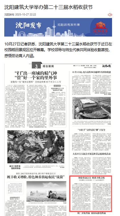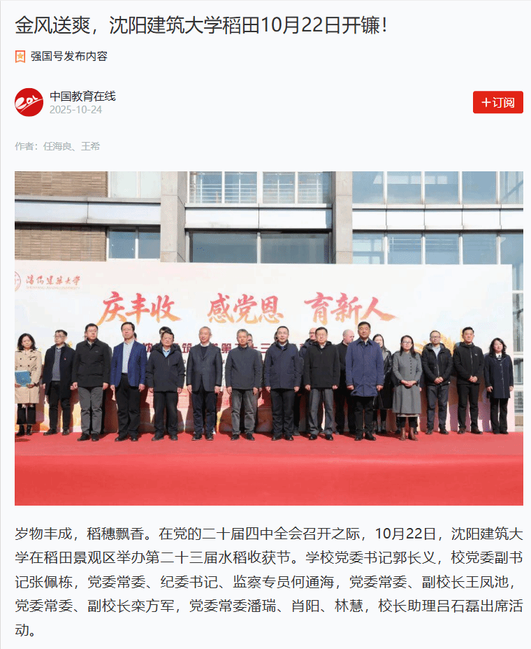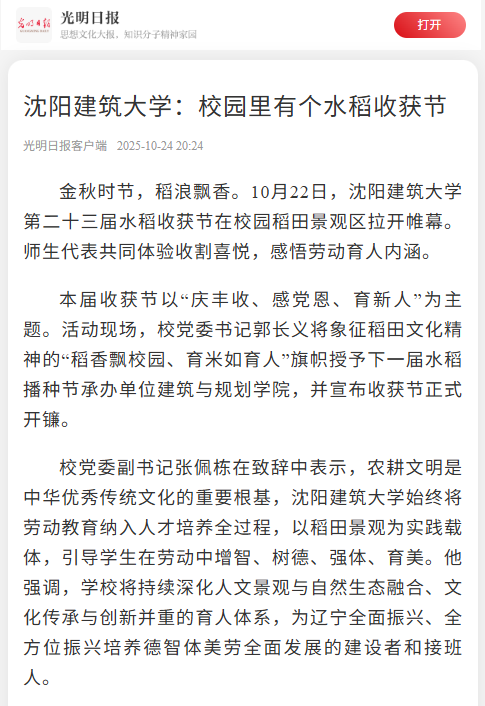 편집자 주: 황금빛 가을에는 쌀파도가 향기롭습니다 10월 22일, 선양젠서대학 제23회 쌀 수확 축제가 캠퍼스 논경관 구역에서 개막됐다 교사 대표와 학생은 함께 수확의 기쁨을 경험하고 노동 교육의 의미를 이해했습니다 광명일보, 설창궈, 요녕일보 국제소통센터, 심양일보 등이 이에 대한 홍보와 보도를 진행했다 이제 관련 보고서가 다음과 같이 재현됩니다